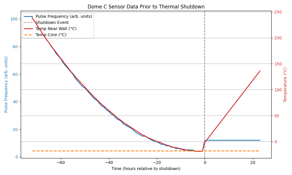 On Day 92 of the deployment, the Dome C sensor array experienced a full thermal fault, triggering emergency shutdown. However, archival ring buffers recovered 2.8 GB of continuous signal log data. Analysis revealed a threefold increase in pulse recurrence frequency over a 96-hour window, beginning 72 hours prior to shutdown. This increase did not correlate with any measured external forcing factor. Preliminary theory suggests dynamic resonance state shifts in subglacial fluid cavities, though further study is required.