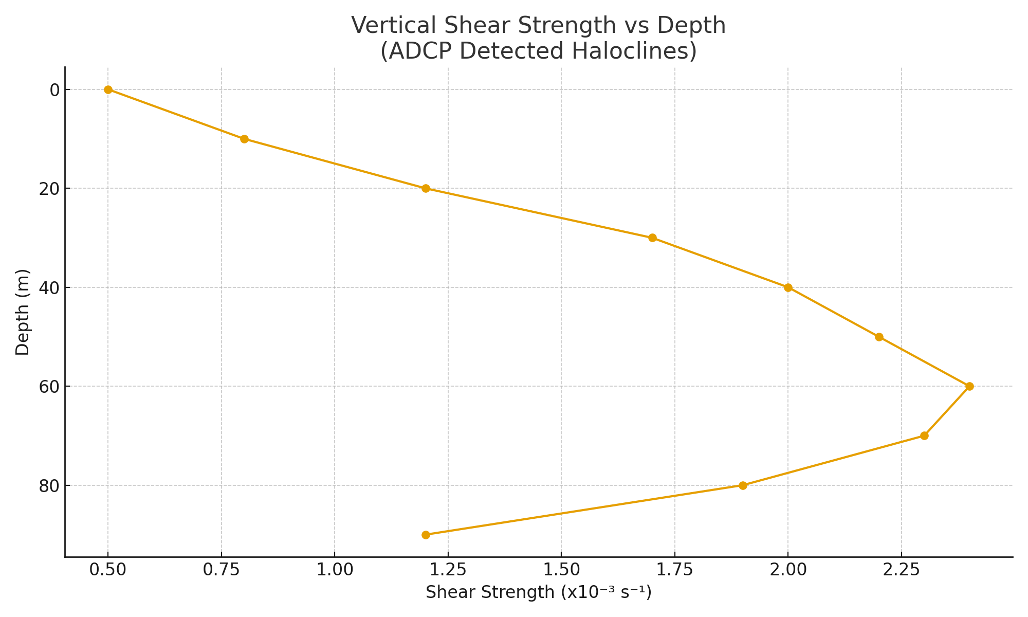 To isolate salinity-derived shear layers, we cross-referenced Doppler shear breaks with in situ CTD profiles and eliminated thermal-only barriers. Acoustic returns were also processed to reveal suspended particulate bands, indirect evidence of halocline entrapment. In 28 of 42 deployments, we observed persistent, non-tidal vertical current shear bands consistent with chemically dense intrusions. These were later confirmed via density inversion checks and salinity anomalies compared to climatological baselines.