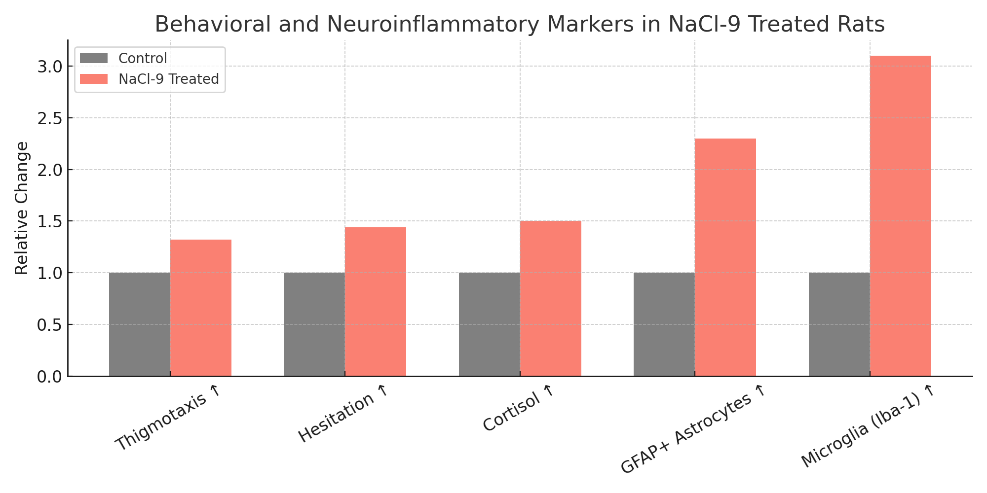 NaCl-9 rats demonstrated significant increases in thigmotaxis (mean +32%, p < 0.001), hesitation time (+44%), and cortisol-linked stress behavior. GFAP+ astrocyte proliferation increased 2.3x in hippocampal regions; microglial activity (Iba-1) increased 3.1x compared to controls. Nile Red staining revealed increased lipid vesicle degradation near mineral-rich zones.
